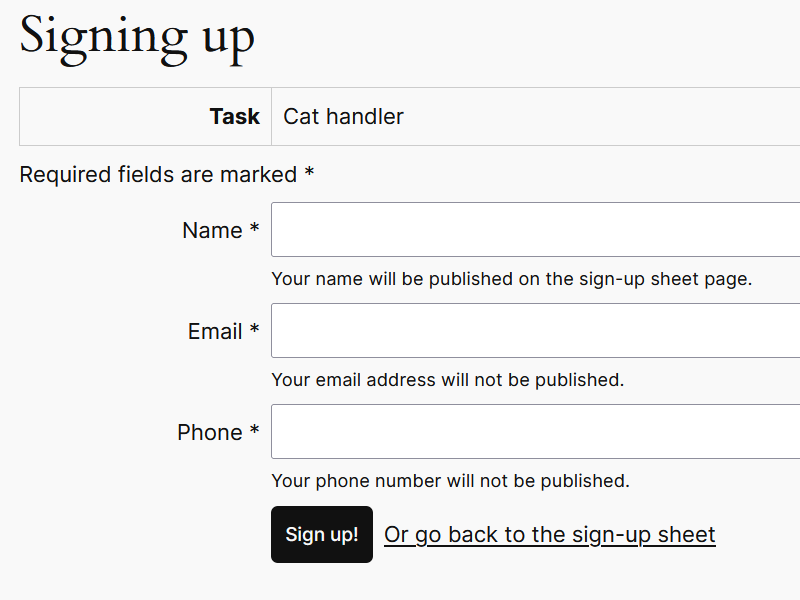 The plugin gives your supporters the option to sign up on the sheet's page. A customizable confirmation email will be sent to the volunteer once they sign up.